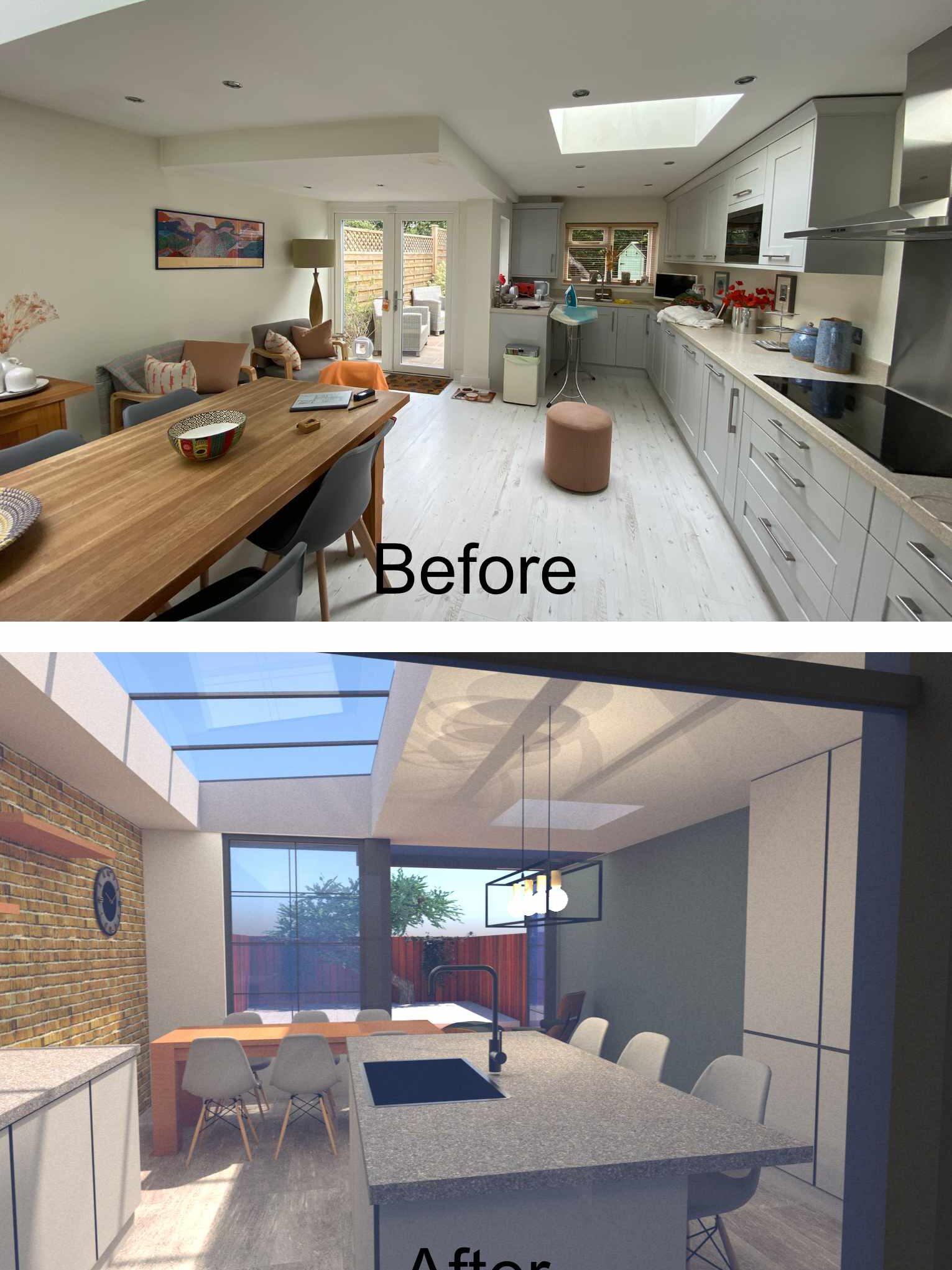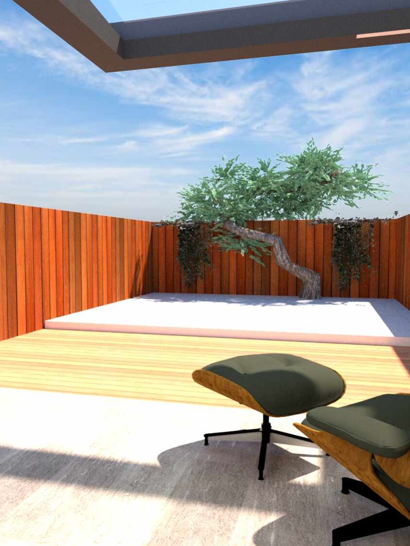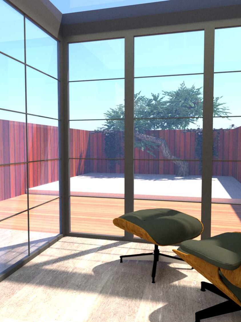 Area for relaxing. Completely opening up the existing outrigger and providing bi-folding glazed doors continuing across the corner with a cantilevered roof that when open, removes all definition between inside and out. A continuation of the flooring material increases the sense of open space.