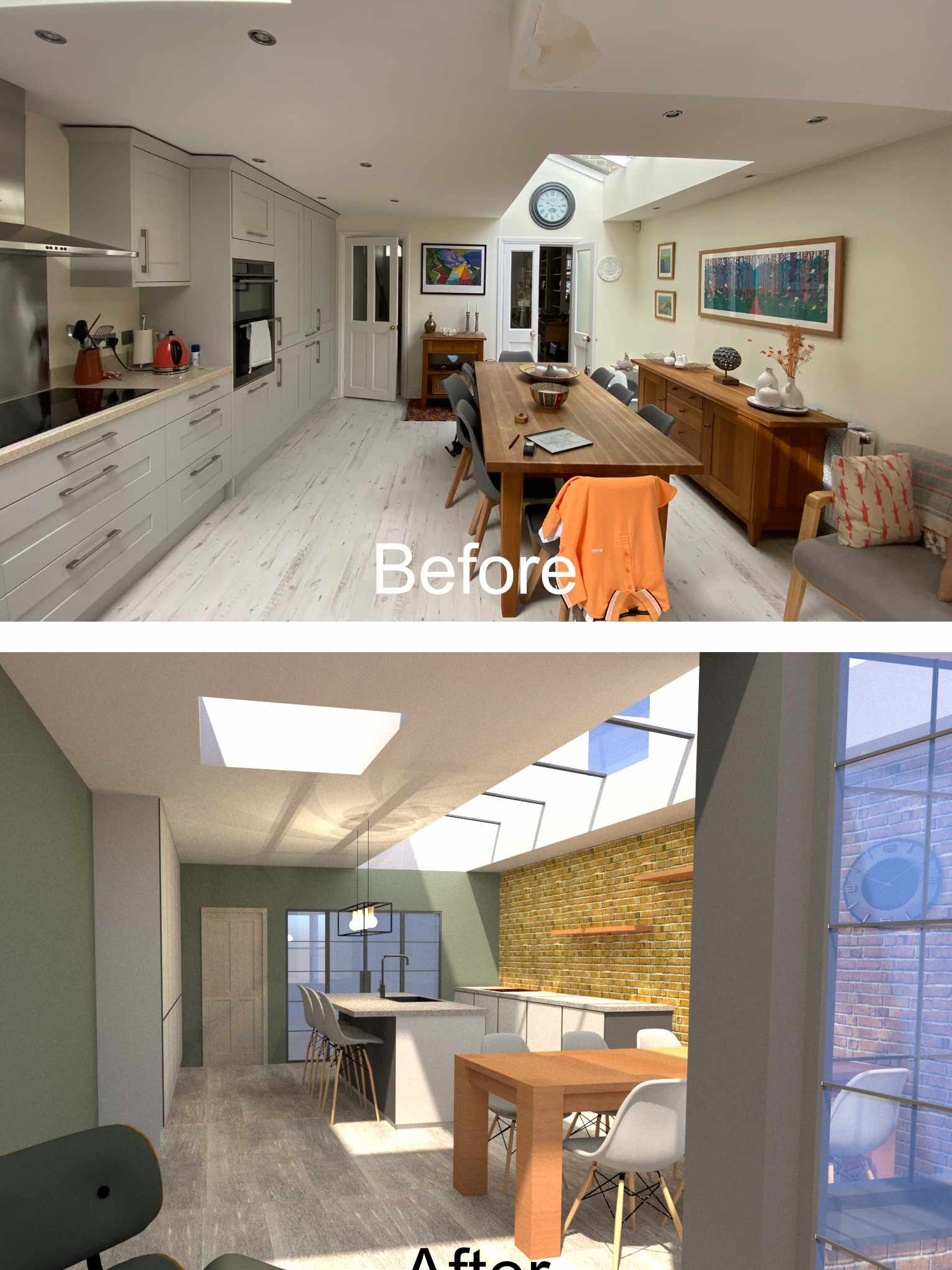 Area for cooking. A new kitchen run with island unit creates a more defined cooking area