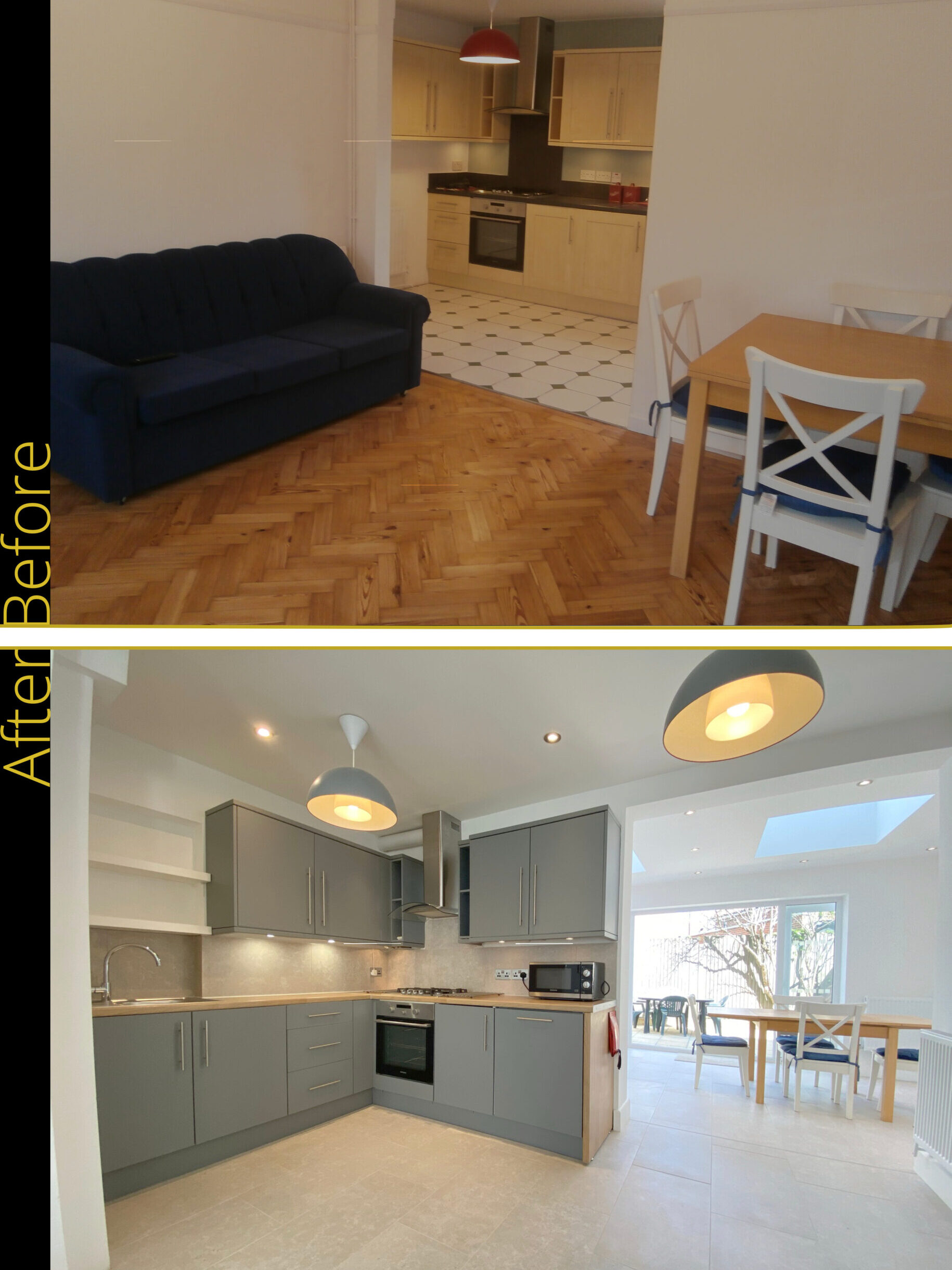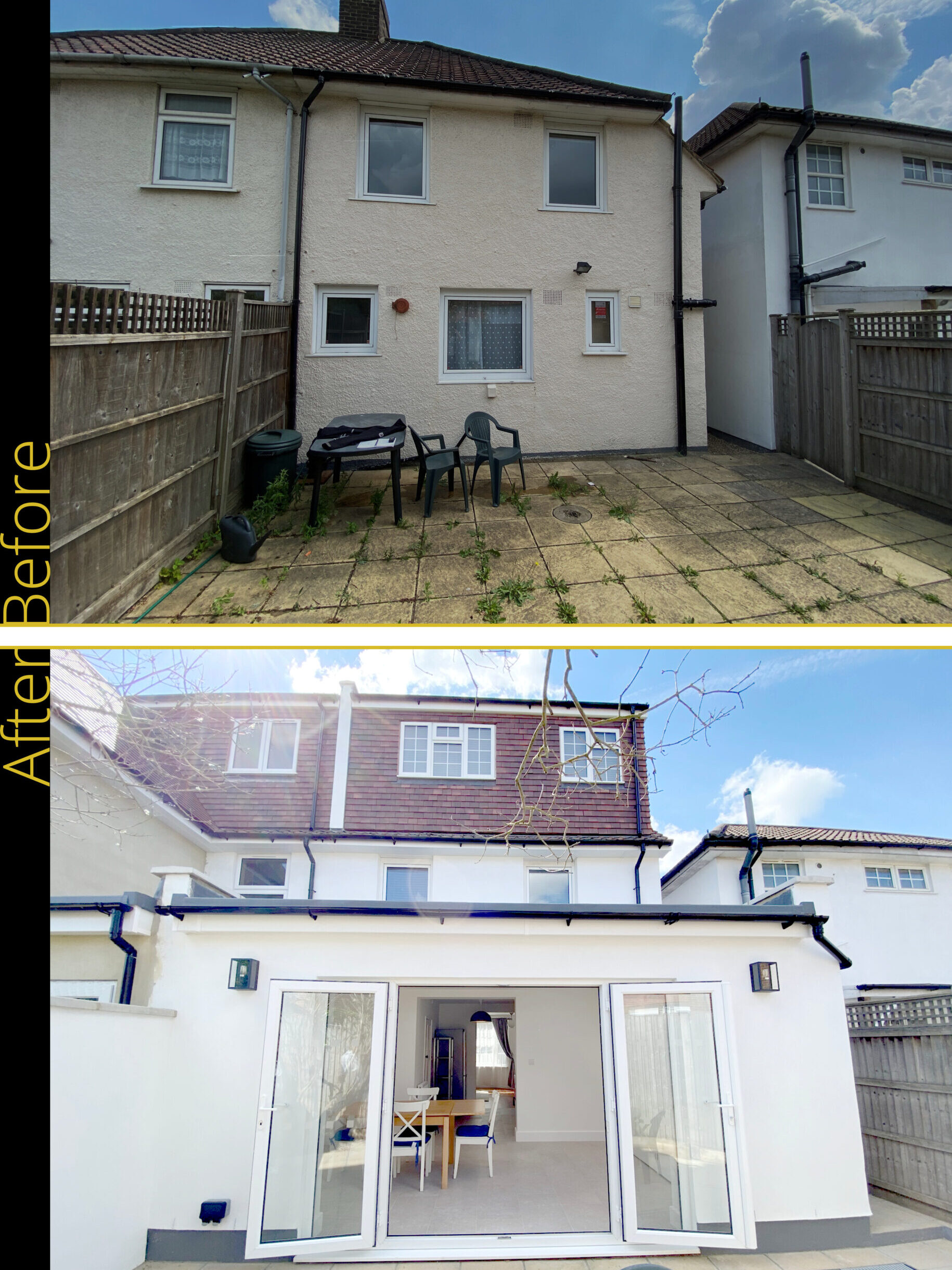The transformed home is now unrecognisable from its original tired and confined former life. Each room now flows seamlessly into the next with a bright and airy breakfast room opening out into the re-landscaped garden. The converted loft adds another bedroom with ensuite and study area.